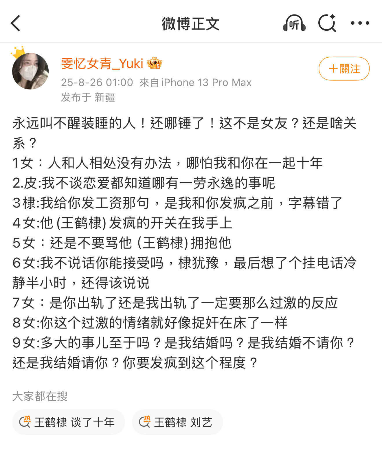 一条 “王鹤棣与女友十年前恋爱”的27分钟吵架录音突然在网络上传播。